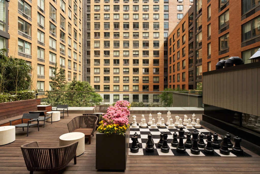 - 32nd floor roof deck with Hudson River views, lounge chairs, outdoor movie theater and a misting wall